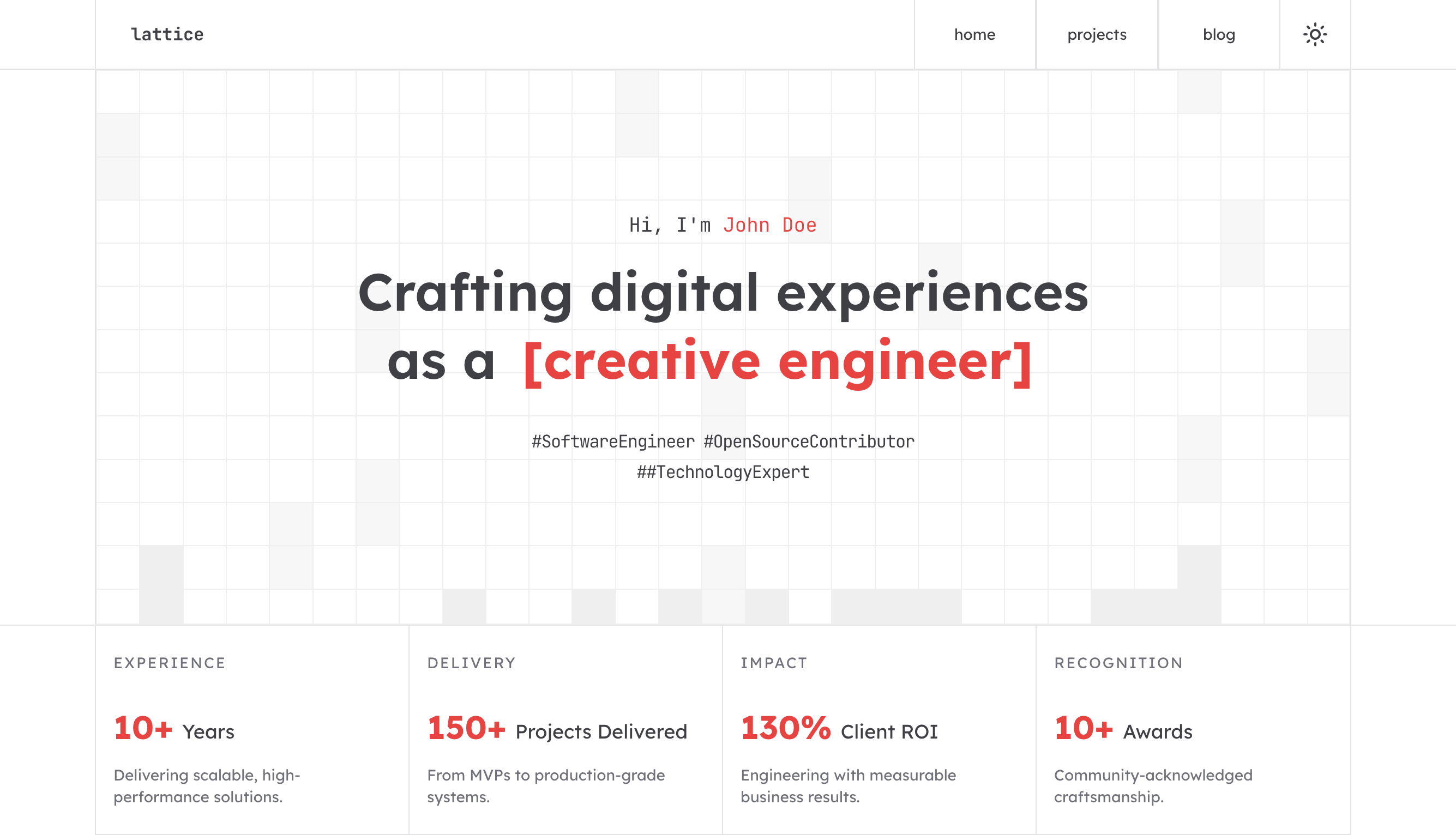 Lattice Portfolio is a modern, minimal portfolio template built with Nuxt 4, Tailwind 4 & Nuxt UI 4 and designed for developers, designers, and creative professionals. It combines elegant aesthetics with powerful functionality to help you showcase your work and tell your story.